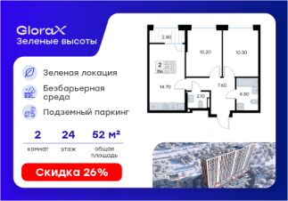 Продается 2-комн. квартира на 24-м этаже в жилом квартале GloraX Зелёные высоты — проекте в тихой зелёной локации. Общая площадь квартиры 52,00 кв. м, из которых 20,50 кв. м включая 20,50 кв. м жилого пространства и 14,70 кв. м кухни. Номер квартиры - 316.