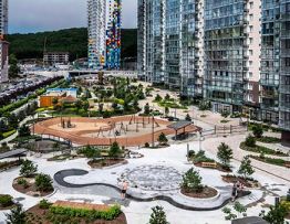 Дом полностью на охране, везде камеры, и закрытая территория. Очень красиво украшают холл к праздникам, и территорию, хорошая детская площадка. Есть площадка для собак. Супер удобные и вкусные кафешки на территории, и небольшие придомовые магазины. Всегда все убрано и чисто, после 22 всегда тихо.