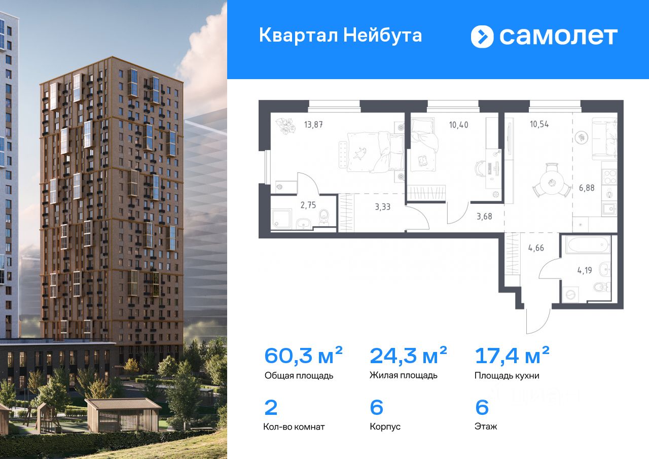 Строим кварталы для жизни с заботой о будущем. Предлагается 2-комнатная квартира комфорт-класса 60,3 кв.м в корпусе 6 на 6 этаже, в ЖК "Квартал Нейбута"