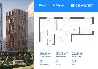 Строим кварталы для жизни с заботой о будущем. Предлагается 2-комнатная квартира комфорт-класса 66,59 кв.м в корпусе 5 на 18 этаже, в ЖК "Квартал Нейбута"