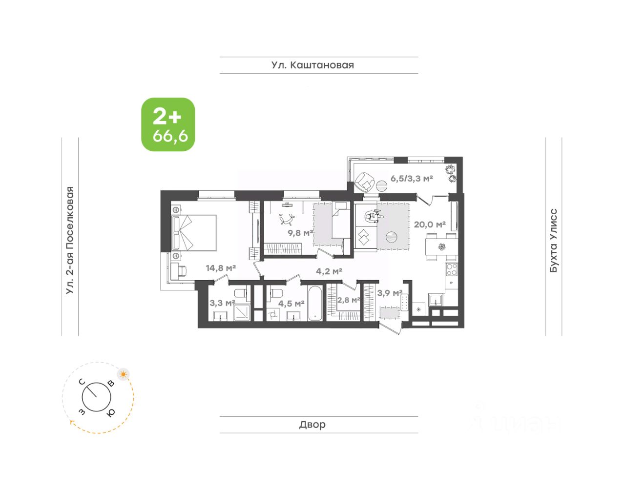 Большая кухня-столовая 20 кв.м с выходом на лоджию 6,5 кв.м место, где вся семья сможет собираться за общим столом и проводить время вместе за завтраком и ужином