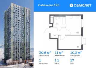 Строим кварталы для жизни с заботой о будущем. Предлагается 1-комнатная квартира комфорт-класса 30,6 кв.м в корпусе 1.1 на 17 этаже, в ЖК "Сабанеева 125"