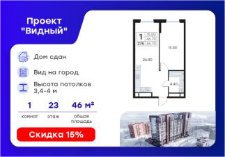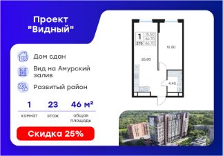 Продается 1-комн. квартира на 23-м этаже в жилом комплексе GloraX Видный — современном проекте комфорт-класса в развитом районе Владивостока. Общая площадь лота составляет 46,61 кв. м, из которых 15,58 кв. м отведено под жилую и 21,32 кв. м под кухонную зону. Номер квартиры - 275.