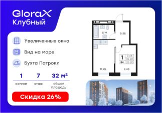 Продается 1-комн. квартира на 7-м этаже в квартале GloraX Клубный. GloraX Клубный - уникальный видовой проект с выделяющейся архитектурой в развитом районе Владивостока. Общая площадь лота составляет 32,20 кв. м, из которых 9,48 кв. м отведено под жилую и 11,95 кв. м под кухонную зону. Номер квартиры - 84.