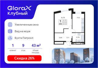 Продается 1-комн. квартира на 9-м этаже в квартале GloraX Клубный. GloraX Клубный - уникальный видовой проект с выделяющейся архитектурой в развитом районе Владивостока. Общая площадь лота составляет 43,04 кв. м, из которых 16,78 кв. м отведено под жилую и 11,61 кв. м под кухонную зону. Номер квартиры - 298.