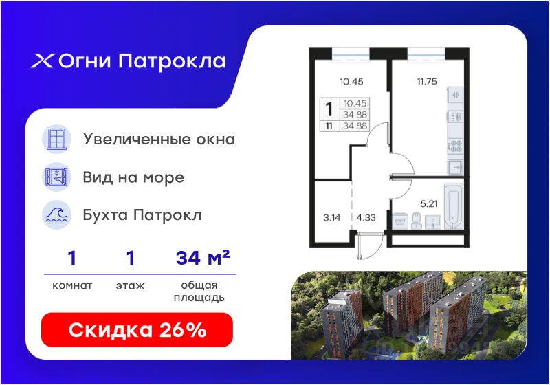 Продается 1-комн. квартира на 1-м этаже в проекте Огни Патрокла от GloraX. Огни Патрокла - уникальный видовой проект с выделяющейся архитектурой в развитом районе Владивостока. Общая площадь лота составляет 34,88 кв. м, из которых 10,45 кв. м отведено под жилую и 11,75 кв. м под кухонную зону. Номер квартиры - 11.