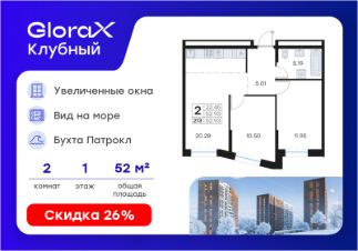 Продается 2-комн. квартира на 1-м этаже в квартале GloraX Клубный. GloraX Клубный - уникальный видовой проект с выделяющейся архитектурой в развитом районе Владивостока. Общая площадь лота составляет 52,93 кв. м, из которых 22,45 кв. м отведено под жилую и 20,28 кв. м под кухонную зону. Номер квартиры - 213.