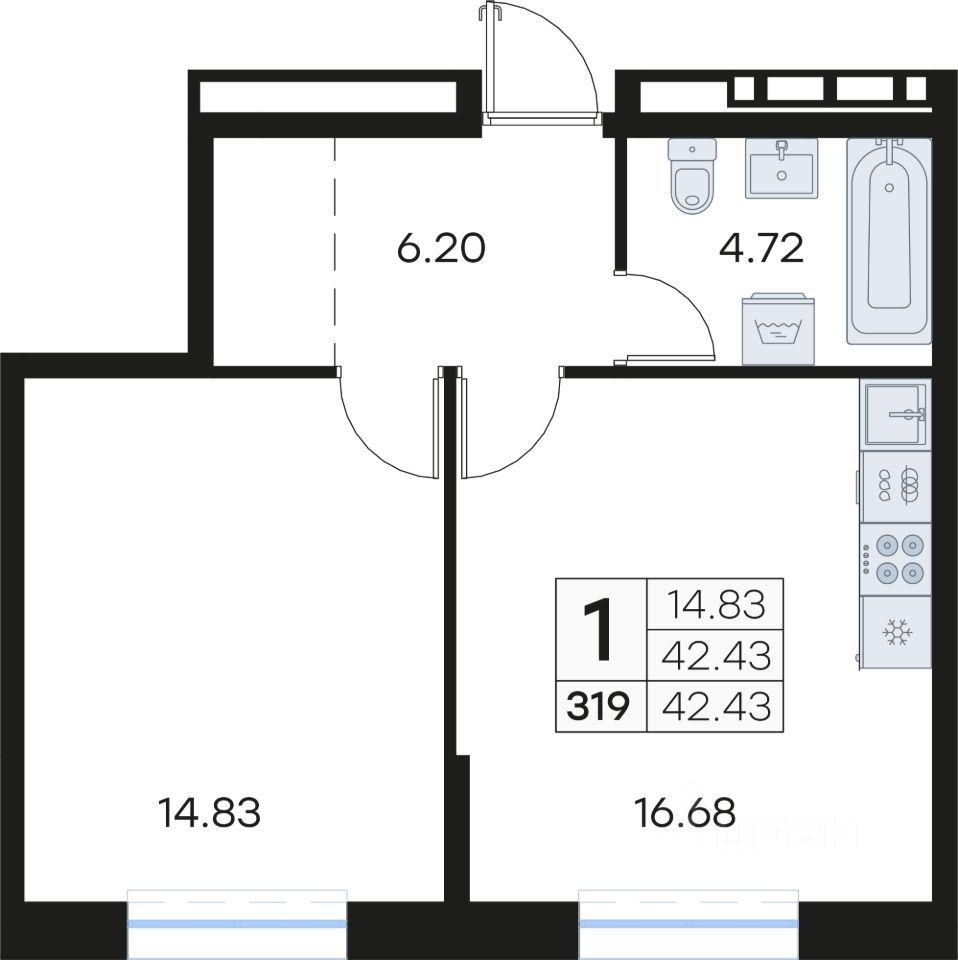 Продается 1-комн. квартира на 9-м этаже в квартале GloraX Клубный. GloraX Клубный - уникальный видовой проект с выделяющейся архитектурой в развитом районе Владивостока. Общая площадь лота составляет 42,43 кв. м, из которых 14,83 кв. м отведено под жилую и 16,68 кв. м под кухонную зону. Номер квартиры - 319.