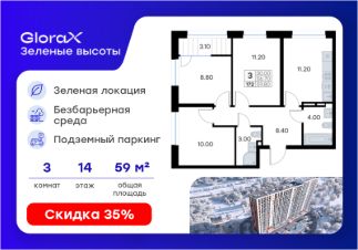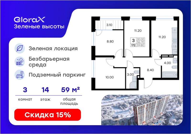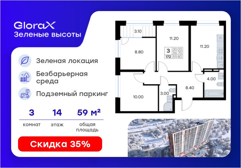 Продается 3-комн. квартира на 14-м этаже в жилом квартале GloraX Зелёные высоты — проекте в тихой зелёной локации. Общая площадь квартиры 59,80 кв. м, из которых 30,00 кв. м включая 30,00 кв. м жилого пространства и 11,20 кв. м кухни. Номер квартиры - 172.