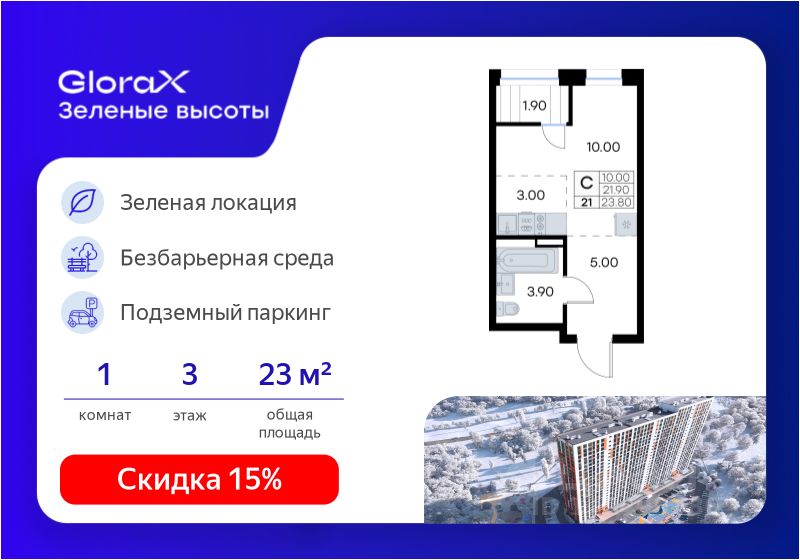 Продается квартира-студия на 3-м этаже в жилом квартале GloraX Зелёные высоты — проекте в тихой зелёной локации. Общая площадь квартиры 23,80 кв. м, из которых 10,00 кв. м включая 10,00 кв. м жилого пространства и 3,00 кв. м кухни. Номер квартиры - 21.