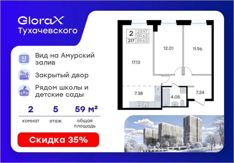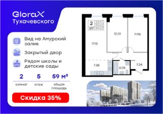 Продается 2-комн. квартира на 5-м этаже в жилом комплексе GloraX Тухачевского — современном проекте нового формата в престижном районе Владивостока. Общая площадь лота составляет 59,63 кв. м, из которых 23,97 кв. м отведено под жилую и 7,38 кв. м под кухонную зону. Номер квартиры - 217. Преимущества квартиры: двухкомнатная квартира. Преимущества проекта: • Панорамный вид на Амурский залив и зелёные сопки • Удачное расположение и транспортная доступность: Первореченский район, 20 минут до центра города • Закрытая охраняемая территория с доступом только для жителей • Эксклюзивное благоустройство: продуманное зонирование, игровые и спортивные площадки, арт-инсталляция, Тайный сад • Безбарьерная среда, видеонаблюдений, Wi-Fi на территории • Премиальный дизайн входных групп реcепшн и лаунж-зоной • Лапомойки, колясочные и туалеты на первом этаже • Подземный паркинг на 449 машиномест с доступом на лифте с жилых этажей • Индивидуальные кладовые на цокольном этаже от 2 до 10 м2 GloraX Тухачевского — это городское пространство нового формата, которое позволяет современным горожанам находить все необходимые атрибуты комфортной жизни внутри своего жилого комплекса. Весь комплекс спроектирован так, чтобы жить здесь было удобно и безопасно: светлые лаунж-зоны и ресепшн на входах в жилые корпуса, эксклюзивный дизайн мест общего пользования и придомовой территории, круглосуточная охрана, видеонаблюдение и даже детский сад в одном из корпусов все, что необходимо современному городскому жителю. GloraX Тухачевского находится в одном из самых престижных районов города с хорошей, давно сформировавшейся инфраструктурой и отличной транспортной доступностью. Отсюда легко добраться до центра города, других районов и даже пригорода как на собственном транспорте, так и на общественном. Квартал имеет прямой выезд на ул. Тухачевского, а рядом с комплексом расположена автобусная остановка на несколько маршрутов. Проект состоит из 3 монолитных корпусов, объединенных единым стилобатом. В комплексе предусмотрены: подземный паркинг с лифтом на жилые этажи, кладовые для хранения, благоустроенный двор без машин, детские и спортивные площадки, зоны для отдыха и прогулок. Эксклюзивный проект благоустройства территории разработан одной из лучших студий ландшафтного дизайна DEREVOPARK с фокусом на комфорт и удобство для всех жителей комплекса. Вся необходимая инфраструктура — магазины, школы, детские сады, остановки общественного транспорта — находится рядом. Узнайте подробности и подберите свою квартиру в GloraX Тухачевского — в отделе продаж уже сегодня. Действуют скидки при определенных условиях покупки. Узнайте подробности в Отделе продаж.