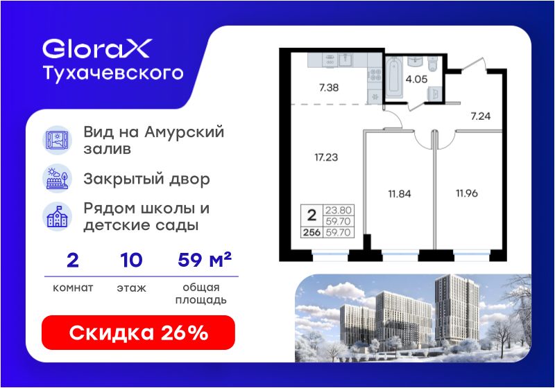 Продается 2-комн. квартира на 10-м этаже в жилом комплексе GloraX Тухачевского — современном проекте нового формата в престижном районе Владивостока. Общая площадь лота составляет 59,70 кв. м, из которых 23,80 кв. м отведено под жилую и 7,38 кв. м под кухонную зону. Номер квартиры - 256.