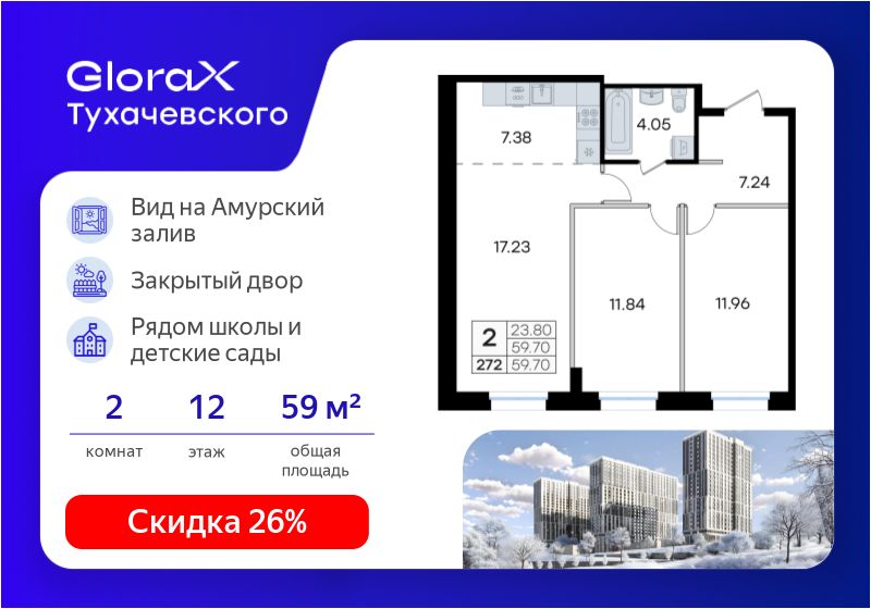 Продается 2-комн. квартира на 12-м этаже в жилом комплексе GloraX Тухачевского — современном проекте нового формата в престижном районе Владивостока. Общая площадь лота составляет 59,70 кв. м, из которых 23,80 кв. м отведено под жилую и 7,38 кв. м под кухонную зону. Номер квартиры - 272.