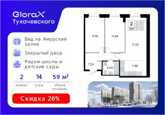 Продается 2-комн. квартира на 14-м этаже в жилом комплексе GloraX Тухачевского — современном проекте нового формата в престижном районе Владивостока. Общая площадь лота составляет 59,70 кв. м, из которых 23,80 кв. м отведено под жилую и 7,38 кв. м под кухонную зону. Номер квартиры - 109.