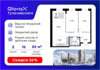 Продается 2-комн. квартира на 16-м этаже в жилом комплексе GloraX Тухачевского — современном проекте нового формата в престижном районе Владивостока. Общая площадь лота составляет 59,76 кв. м, из которых 23,63 кв. м отведено под жилую и 7,38 кв. м под кухонную зону. Номер квартиры - 305.