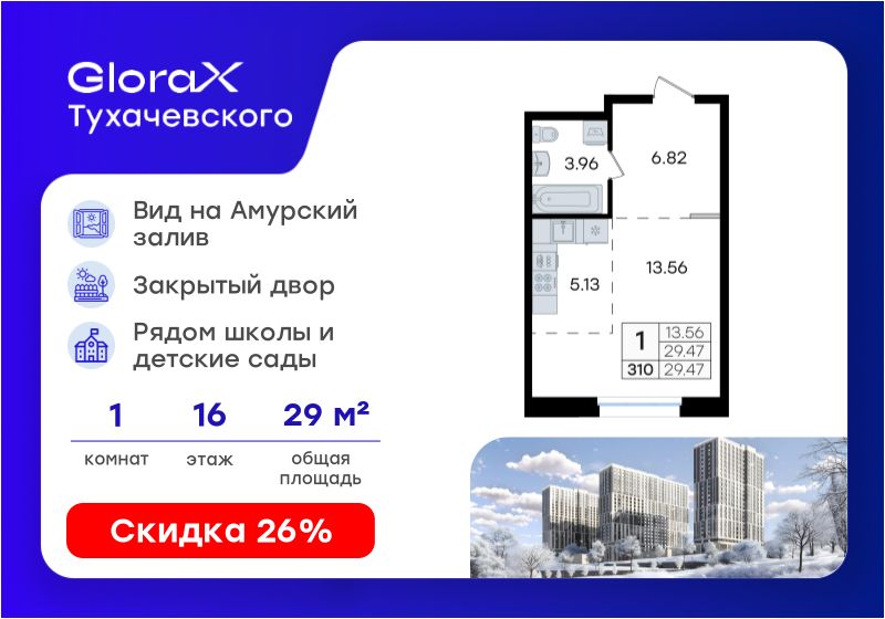 Продается квартира-студия на 16-м этаже в жилом комплексе GloraX Тухачевского — современном проекте нового формата в престижном районе Владивостока. Общая площадь лота составляет 29,47 кв. м, из которых 13,56 кв. м отведено под жилую и 5,13 кв. м под кухонную зону. Номер квартиры - 310.