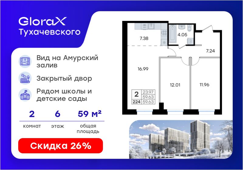 Продается 2-комн. квартира на 6-м этаже в жилом комплексе GloraX Тухачевского — современном проекте нового формата в престижном районе Владивостока. Общая площадь лота составляет 59,63 кв. м, из которых 23,97 кв. м отведено под жилую и 7,38 кв. м под кухонную зону. Номер квартиры - 224.