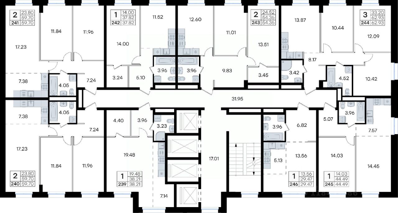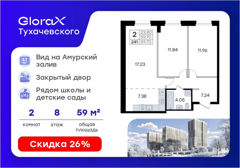 Продается 2-комн. квартира на 8-м этаже в жилом комплексе GloraX Тухачевского — современном проекте нового формата в престижном районе Владивостока. Общая площадь лота составляет 59,70 кв. м, из которых 23,80 кв. м отведено под жилую и 7,38 кв. м под кухонную зону. Номер квартиры - 241.