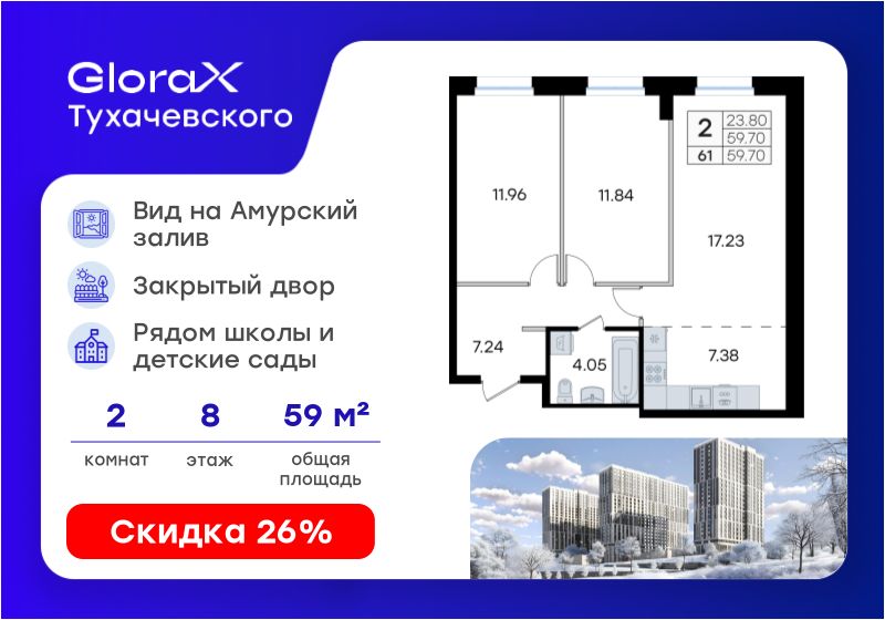 Продается 2-комн. квартира на 8-м этаже в жилом комплексе GloraX Тухачевского — современном проекте нового формата в престижном районе Владивостока. Общая площадь лота составляет 59,70 кв. м, из которых 23,80 кв. м отведено под жилую и 7,38 кв. м под кухонную зону. Номер квартиры - 61.