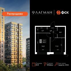 Продаётся 1-к квартира номер 617 общей площадью 38.8 кв.м. на 11-м этаже 12 этажного здания. Отделка Whitebox. Цена с учётом скидки.