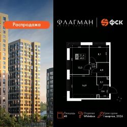 Продаётся 2-к квартира номер 294 общей площадью 48 кв.м. на 3-м этаже 22 этажного здания. Отделка Whitebox. Цена с учётом скидки.
