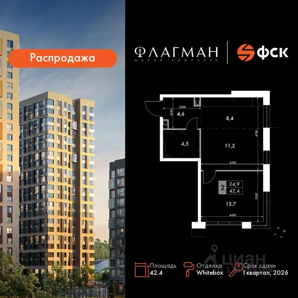 Продаётся 2-к квартира номер 312 общей площадью 42.4 кв.м. на 4-м этаже 22 этажного здания. Отделка Whitebox. Цена с учётом скидки.