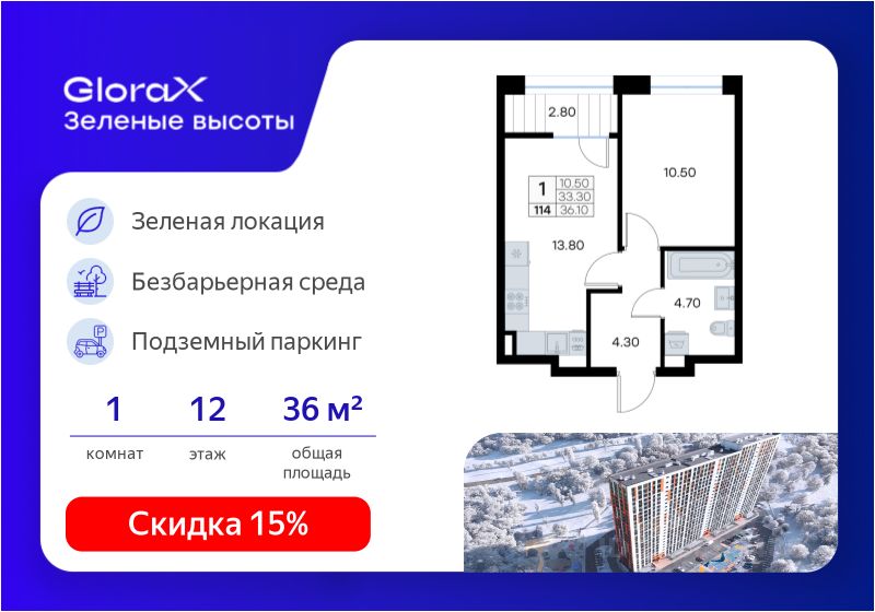 Продается 1-комн. квартира на 12-м этаже в жилом квартале GloraX Зелёные высоты — проекте в тихой зелёной локации. Общая площадь квартиры 36,10 кв. м, из которых 10,50 кв. м включая 10,50 кв. м жилого пространства и 13,80 кв. м кухни. Номер квартиры - 114.