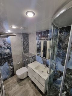 На полу - ПВХ плитка, стены покраска+обои, потолки - натяжные, в санузле керамогранит, окна пластиковые.