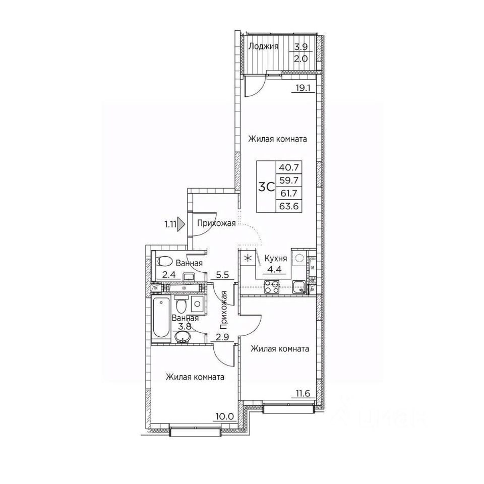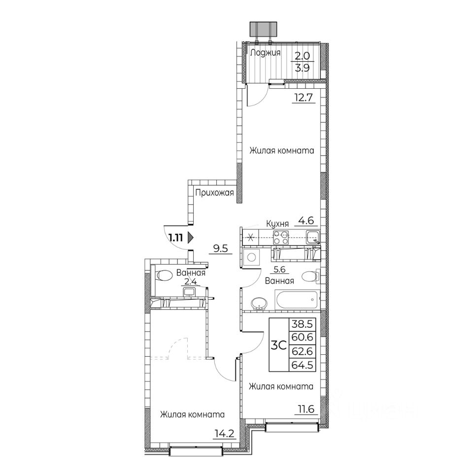 Общая площадь квартиры — 63.6 кв. м, этаж 16 из 20.