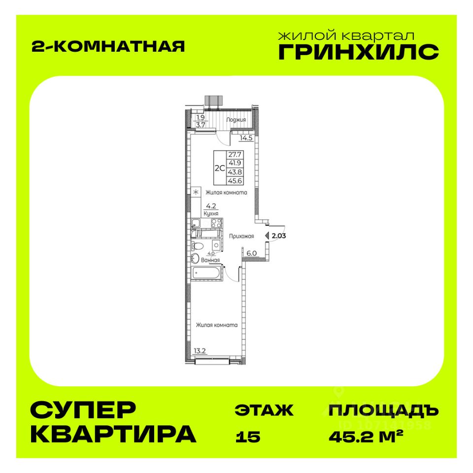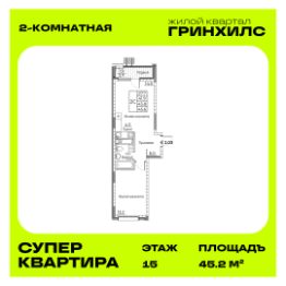 Общая площадь квартиры — 45.2 кв. м, этаж 15 из 21.