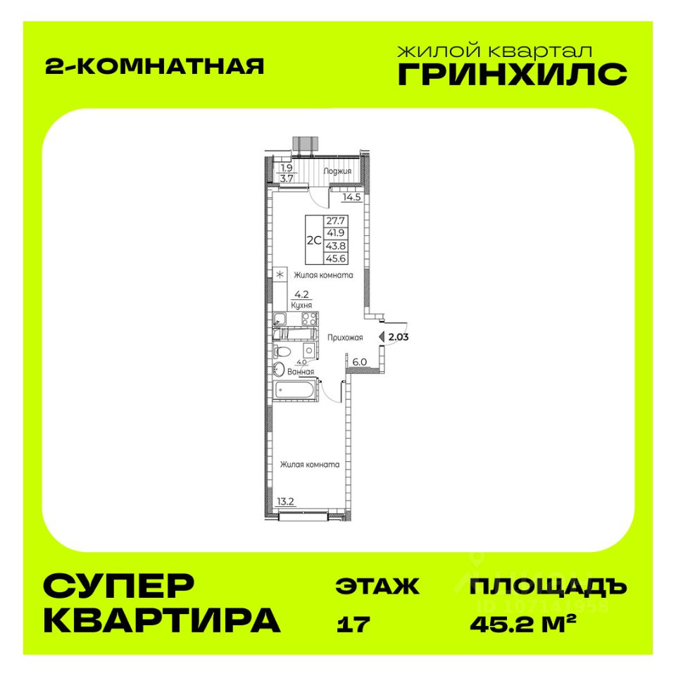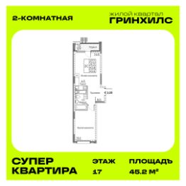 Общая площадь квартиры — 45.2 кв. м, этаж 17 из 21.