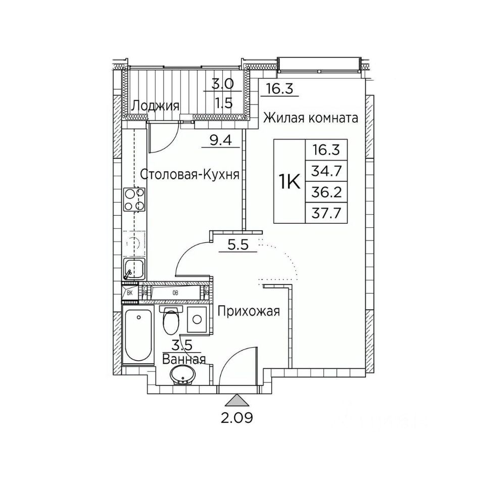 Общая площадь квартиры — 37.7 кв. м, этаж 8 из 23.