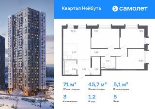Строим кварталы для жизни с заботой о будущем. Предлагается 3-комнатная квартира комфорт-класса 70,97 кв.м в корпусе 1.2 на 5 этаже, в ЖК "Квартал Нейбута"