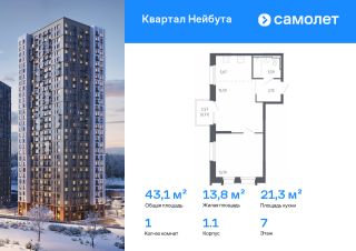 Строим кварталы для жизни с заботой о будущем. Предлагается 1-комнатная квартира комфорт-класса 43,13 кв.м в корпусе 1.1 на 7 этаже, в ЖК "Квартал Нейбута"