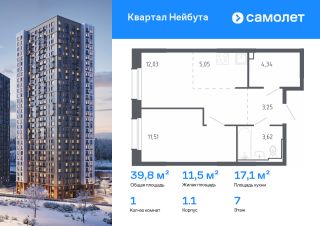 Строим кварталы для жизни с заботой о будущем. Предлагается 1-комнатная квартира комфорт-класса 39,8 кв.м в корпусе 1.1 на 7 этаже, в ЖК "Квартал Нейбута"