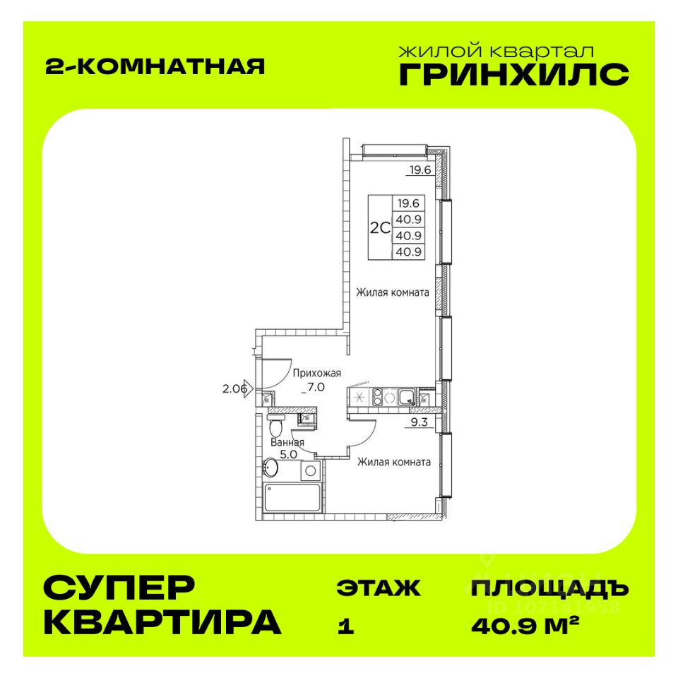 Общая площадь квартиры — 40.9 кв. м, этаж 1 из 21.