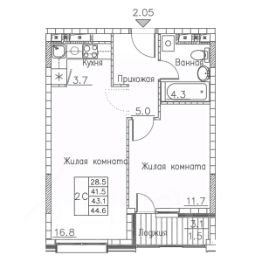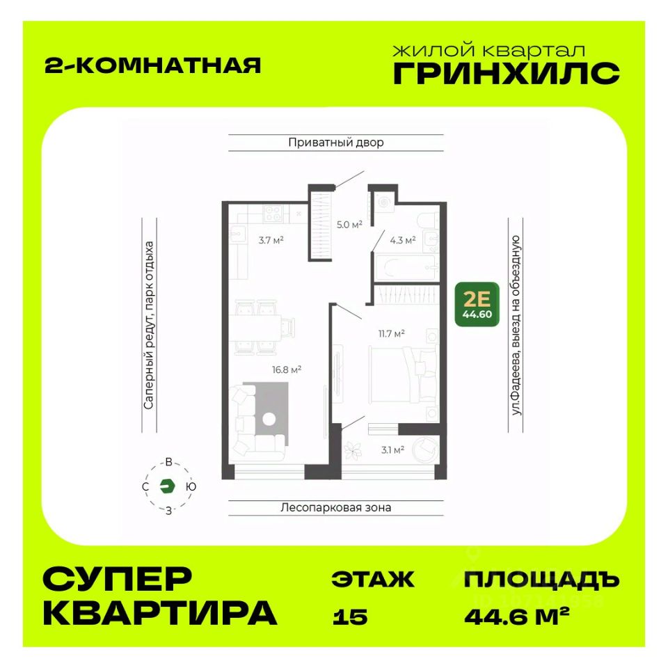 Общая площадь квартиры — 44.6 кв. м, этаж 15 из 19.