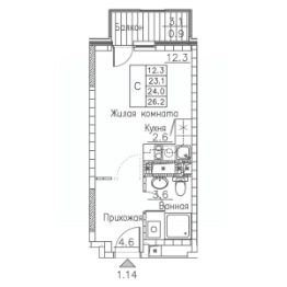 Продаётся студия в строящемся доме (Расула Гамзатова, 7к1 (Корпус 1)), срок сдачи: II-кв. 2026, общей площадью 26 кв.м., на 14 этаже. GreenHills - обособленный тихий жилой комплекс, состоящий из 3 корпусов. Проект расположен в экологически чистом месте города. На территории комплекса находится развитая инфраструктура с объектами торговли и услуг. Квартиры с эргономичными планировками, уютный двор, подземный паркинг и кладовки: здесь есть все, что нужно для комфортной спокойной жизни.