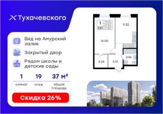 Продается 1-комн. квартира на 19-м этаже в жилом комплексе Тухачевского от GloraX — современном проекте нового формата в престижном районе Владивостока. Общая площадь лота составляет 37,82 кв. м, из которых 14,00 кв. м отведено под жилую и 11,52 кв. м под кухонную зону. Номер квартиры - 330.