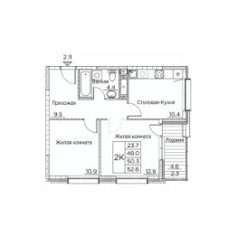Общая площадь квартиры — 52.6 кв. м, этаж 23 из 23.