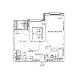 Общая площадь квартиры — 56.1 кв. м, этаж 13 из 19.