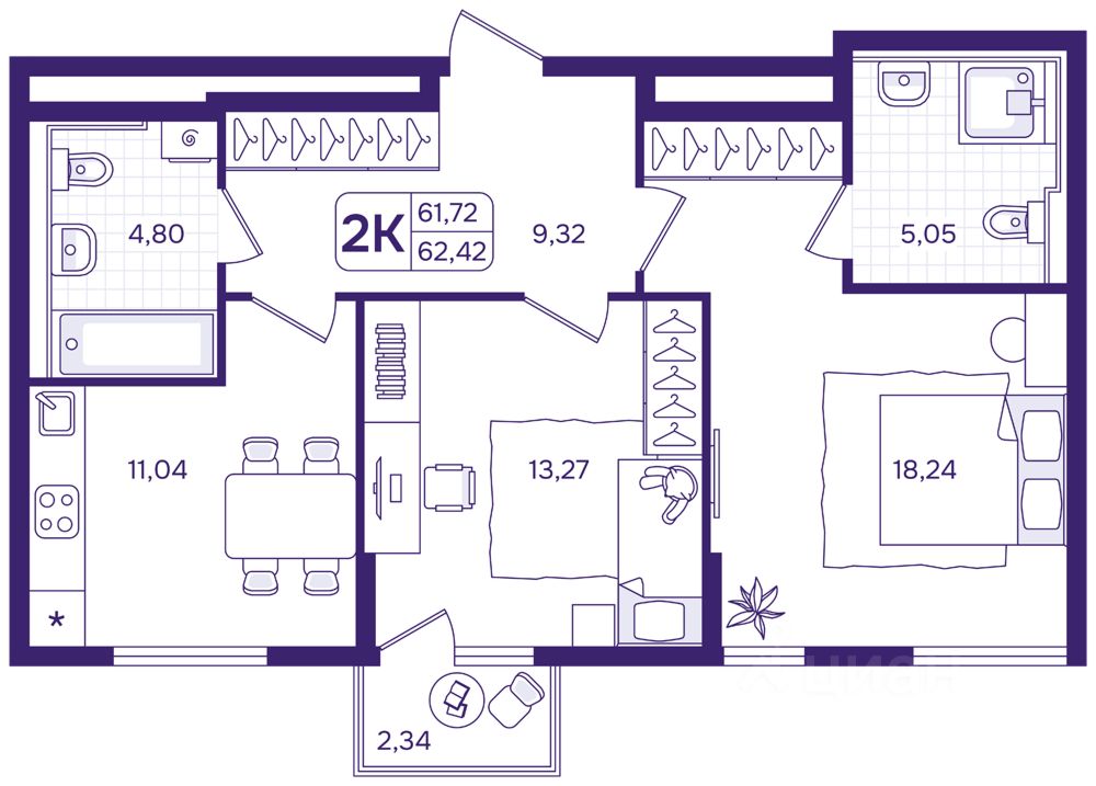 Семейная 2-комнатная квартира с балконом и мастер-спальней отлично подойдет для проживания пары с детьми.