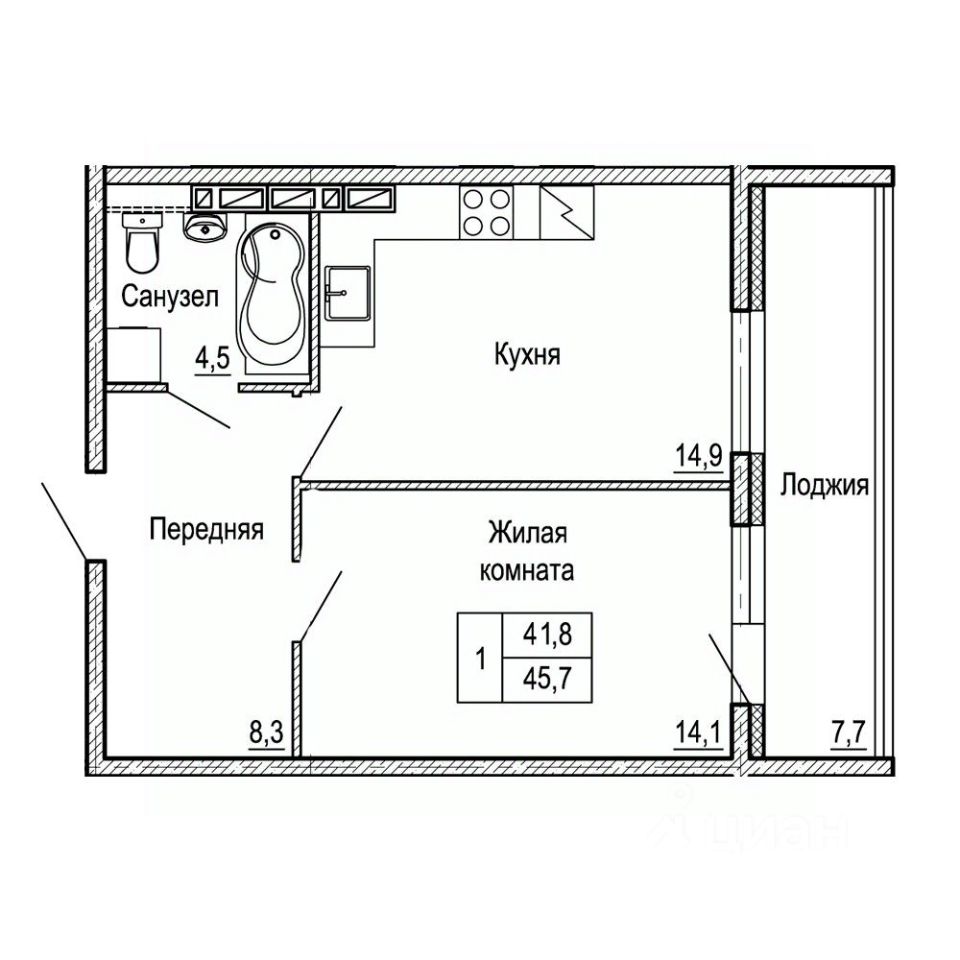 Общая площадь45,7 м²