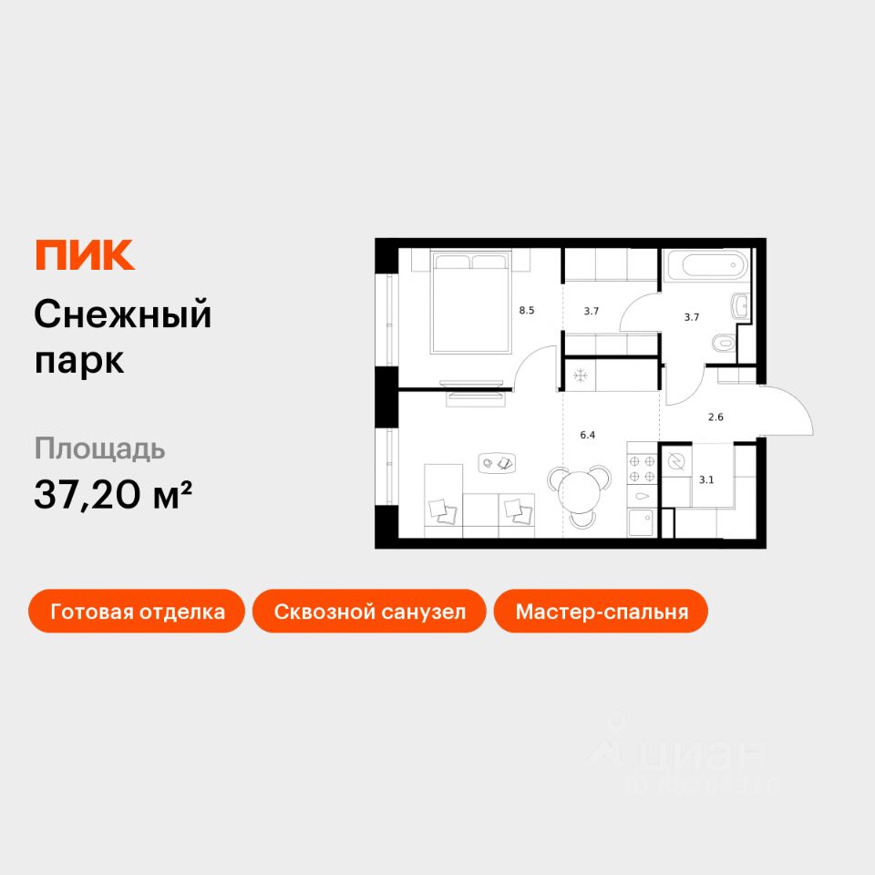 Продаётся 1-комн. квартира площадью 37,2 кв.м на 24 этаже 25 этажного дома (Корпус 4, Секция 2) проекта ПИК Снежный парк. Светлый просторный подъезд на уровне земли, функциональная планировка, большие окна, c отделкой.