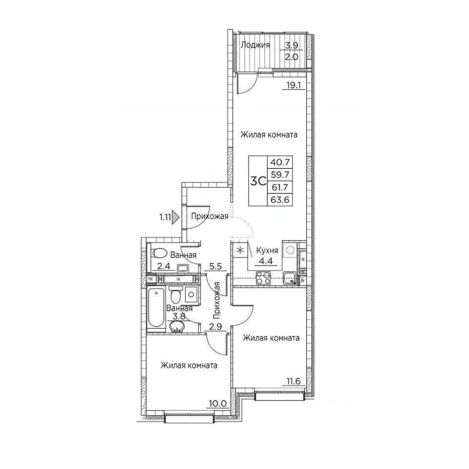 Общая площадь квартиры — 63.6 кв. м, этаж 7 из 20.