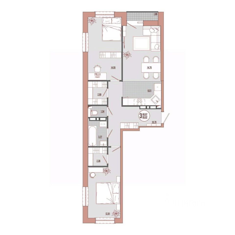 Продаётся 3-комнатная квартира в строящемся доме (Корпус 1), срок сдачи: III-кв. 2026, общей площадью 69.92 кв.м., на 20 этаже. Новый жилой дом от застройщика "СЗ Стоунлэнд" расположен по адресу: Россия, Приморский край, Владивосток, улица Адмирала Юмашева
