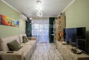 Остается современный кухонный гарнитур со встроенной бытовой техникой. Встроенные шкафы купе.