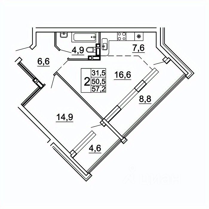 Общая площадь57,2 м²