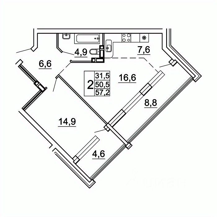 Общая площадь57,2 м²