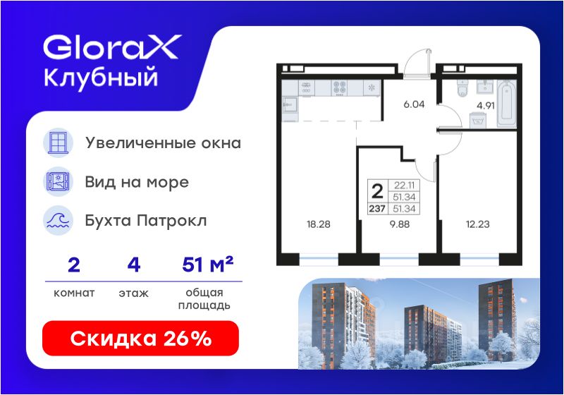Продается 2-комн. квартира на 4-м этаже в квартале GloraX Клубный. GloraX Клубный - уникальный видовой проект с выделяющейся архитектурой в развитом районе Владивостока. Общая площадь лота составляет 51,34 кв. м, из которых 22,11 кв. м отведено под жилую и 18,28 кв. м под кухонную зону. Номер квартиры - 237.